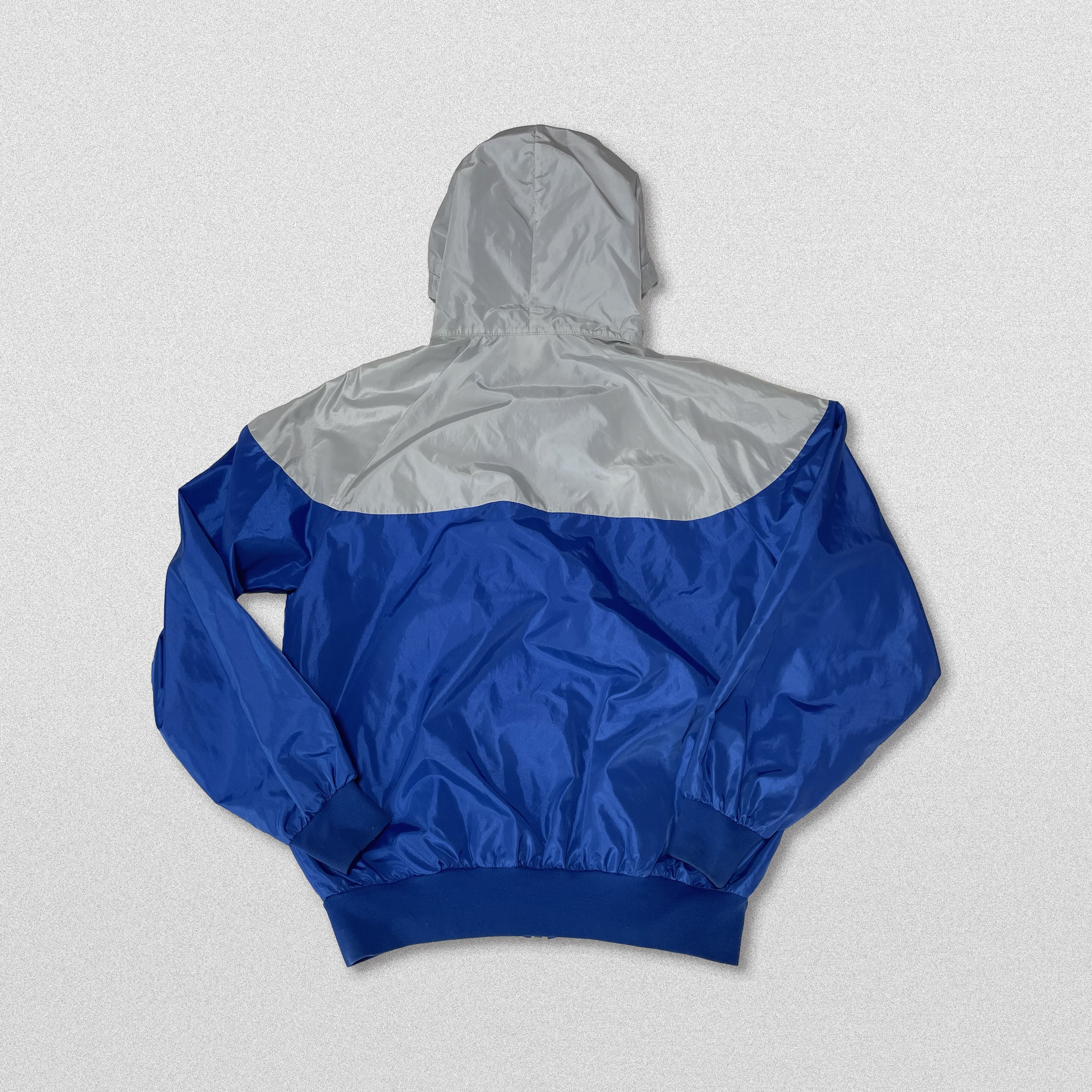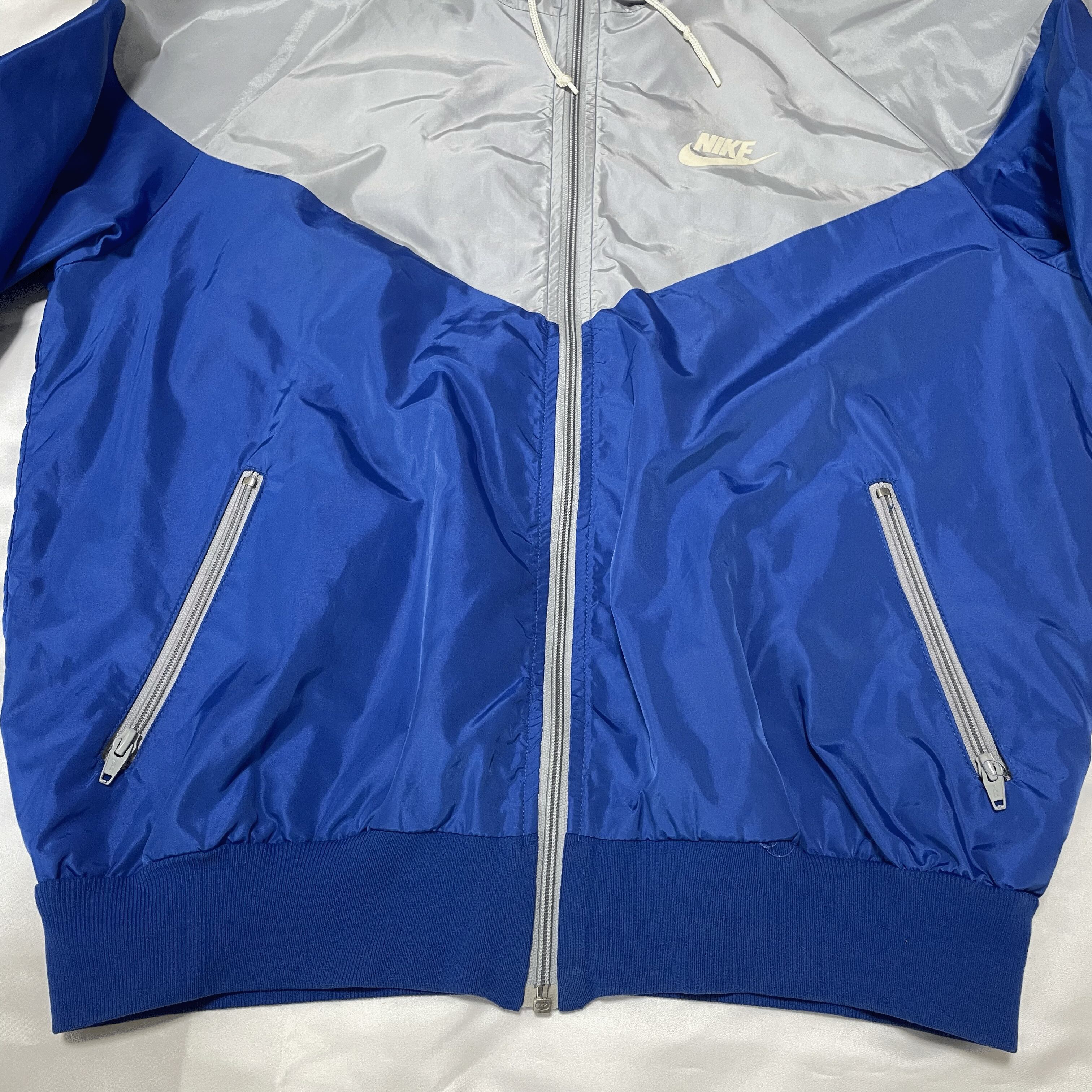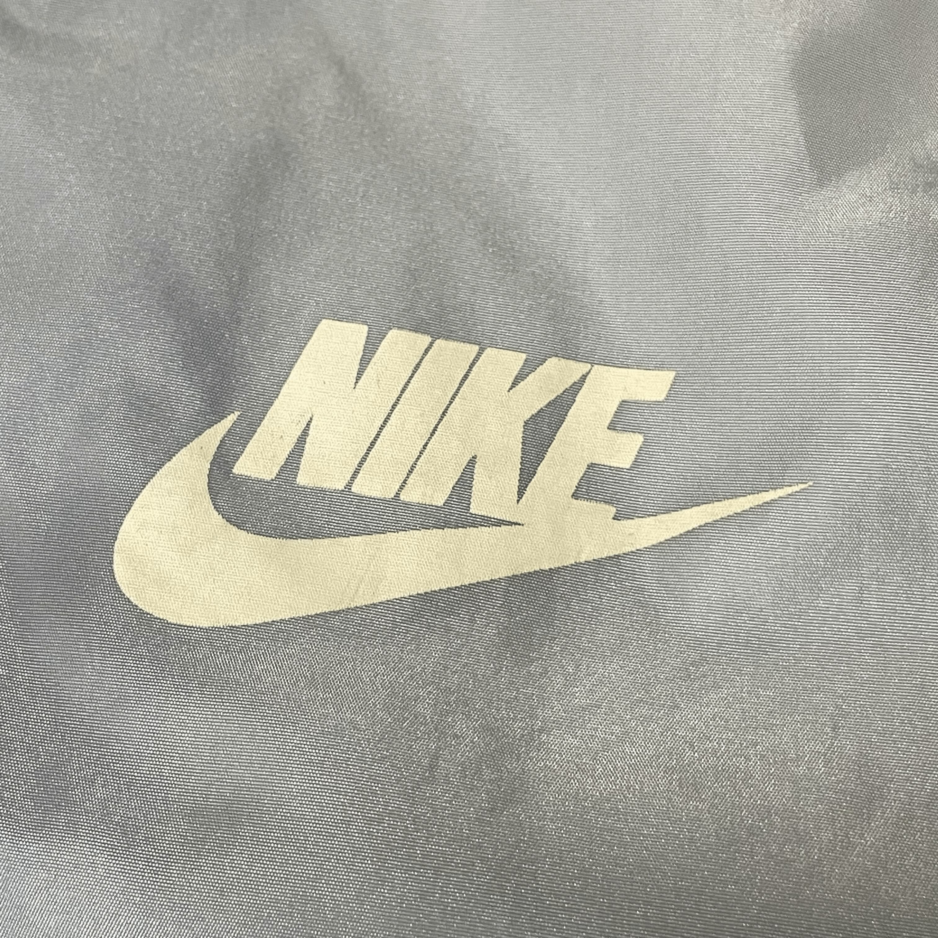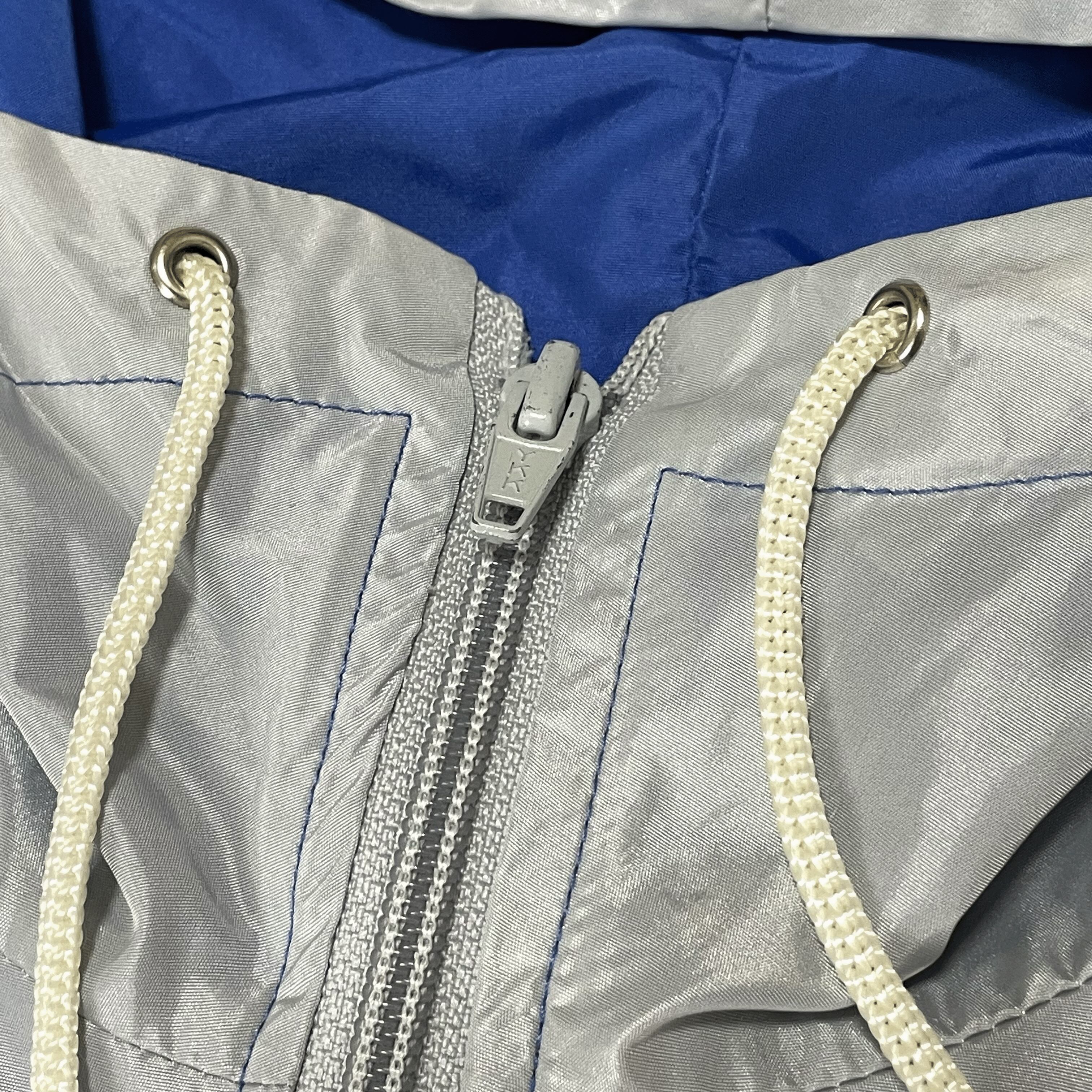 1980年代に生産され、現在も復刻版が販売されているナイキの定番ウィンドブレーカーの「ウィンドランナージャケット」です。鮮やかなブルーとライトグレーの切り替えしデザイン。胸元にナイキロゴのプリント。ジップはYKK。リブもしっかりしています。タグは80年代のナイキにみられる紺タグ。2枚目のタグの文字がかすれて読めませんが、恐らく台湾製になります。基本的に痩せた体形のランナーがジャストで着る用途がメイン服だったため、XLの大きめサイズは珍しいです。全体的に汚れやダメージがなく非常に状態の良い1着。